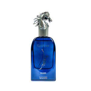 Mahir Black celebreaza puterea, misterul si eleganta masculina suprema prin culoarea albastru midnight aproape negru - nuanta care evoca noaptea profunda, cerul instelat si autoritatea discreta. Negru-ul (sau albastru foarte inchis) simbolizeaza puterea, misterul, eleganta si autoritatea - calitati ale barbatului modern care conduce fara ostentatie si impresioneaza fara efort. Capul de cal argintiu pe capac si silueta in relief argintiu pe cutia gri-albastru inchis simbolizeaza contrastul elegant intre putere si rafinament, mister si claritate, noapte si lumina.