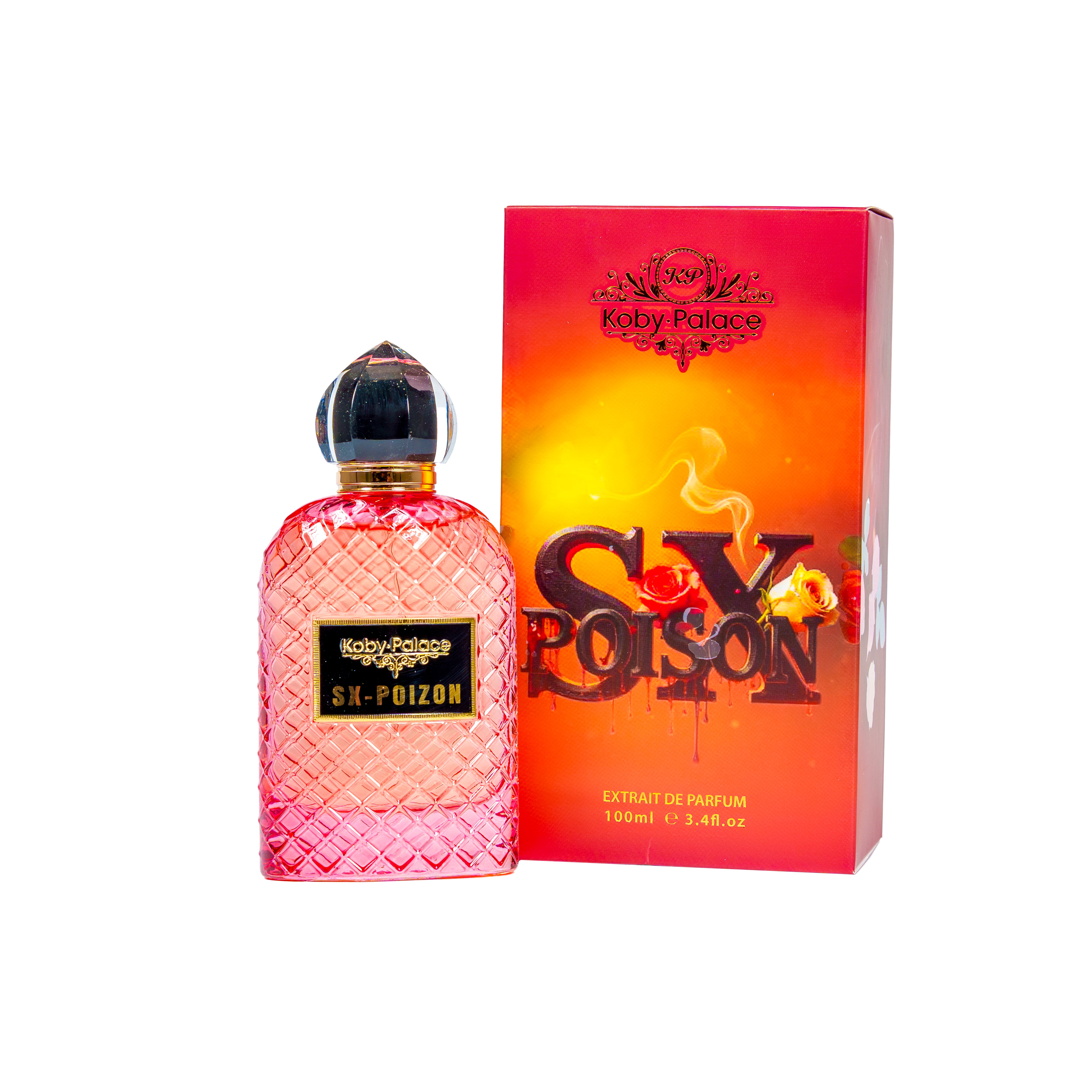 Koby Palace SX Poizon celebreaza puterea seductiei feminine prin numele provocator "SX Poizon" (Sex Poison - otrava sexuala) - metafora perfecta pentru un parfum atat de intens, magnetic si irezistibil incat actioneaza ca o otrava dulce care captiveaza si sedu ce fara escapare. Cutia in degradeu dramatic rosu-portocaliu-galben cu logo-ul "SX POISON" in relief evoca focul pasiunii, intensitatea dorintei si caldura seductiei. Flaconul roz-coral fatetat cu capac cristal negru simbolizeaza dualitatea feminitatii moderne: dulceata externa si putere interioara, eleganta rafinata si caracter provocator.